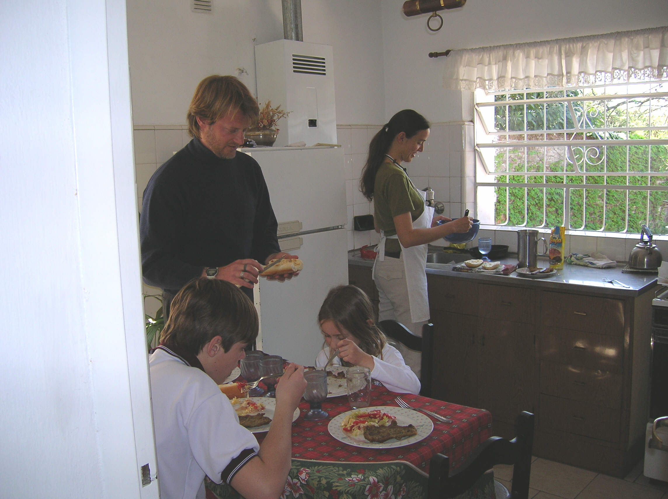The woman is slim and has long brown hair. She is wearing white trousers and a green top. She is wearing an apron because she is working in the kitchen. The man is fair and has a beard. He is wearing a blue jumper.The boy is older than his sister. He may be about 12 years old and the girl is about six.